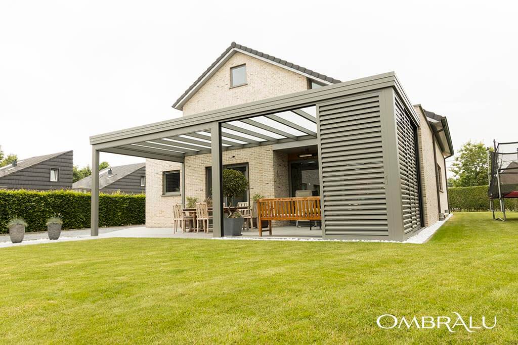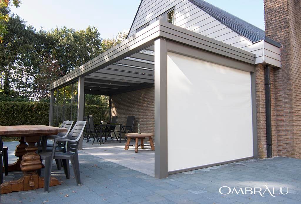 Son chéneau périphérique plat lui permet de recevoir tout naturellement des stores screens pour fermer partiellement ou entièrement cet espace. Idéale, par exemple, pour protéger un SPA des courants d'airs, des regards indiscrets et du soleil.