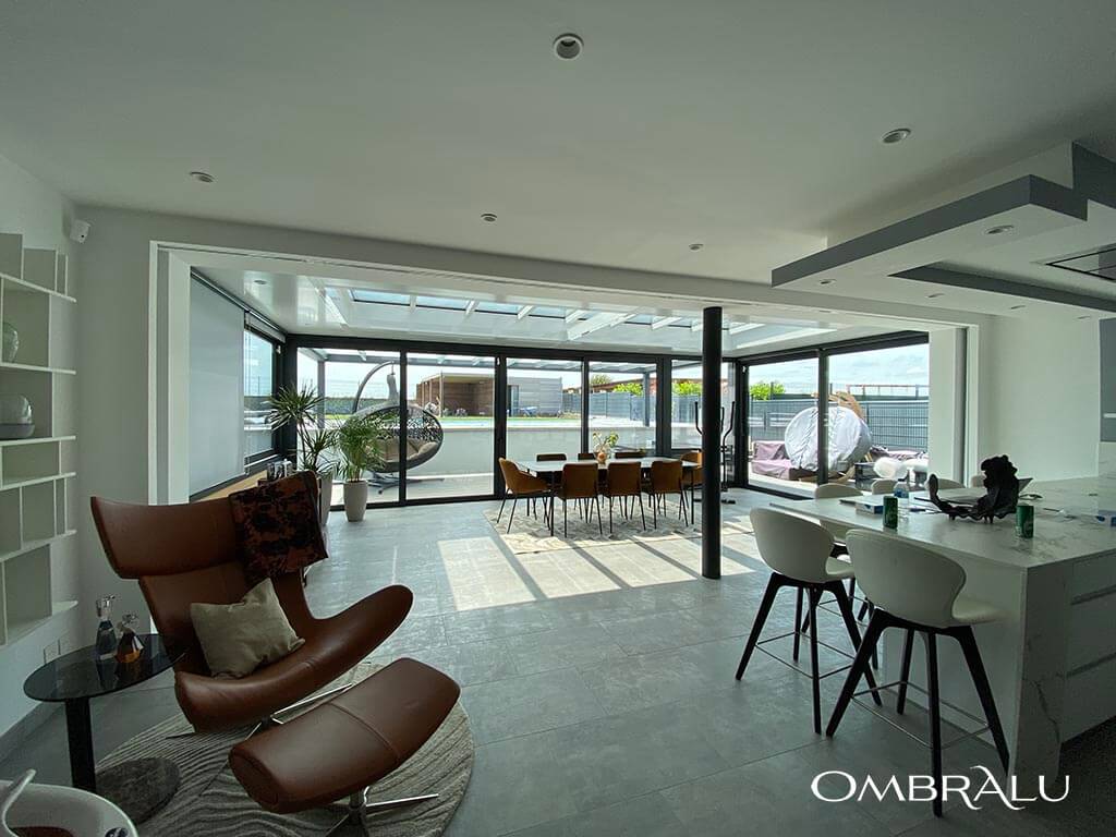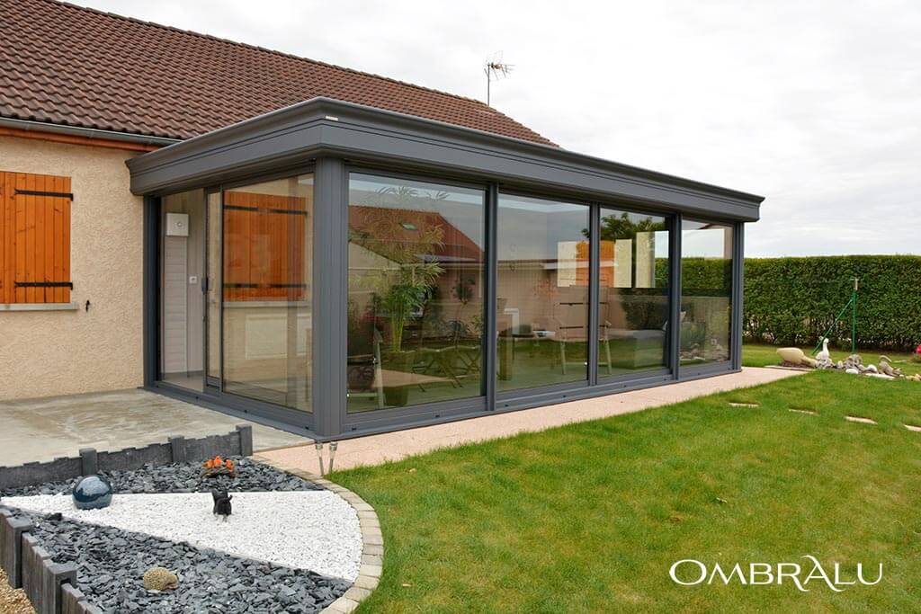 VERANDOME FIDJI est une véranda rectangulaire à toiture plate équipée suivant sa largeur de façade d’un dôme plat (sans pente). Le chéneau périphérique est équipé d’office de la réhausse softline.